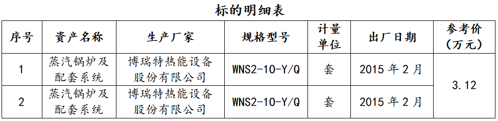 一、拍賣標(biāo)的:廢舊蒸汽鍋爐及配套系統(tǒng)2套,整體打包拍賣,參考價(jià):3.12萬(wàn)元,競(jìng)買保證金:2萬(wàn)元。